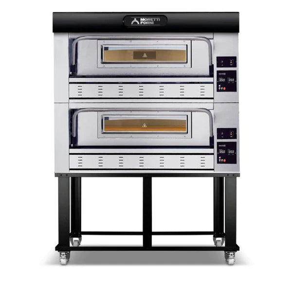 Moretti Forni Pizza Oven, natural gas, deck-type, (2) 44"W x 29"D x 7"H decks, (14) 12" or (4) 18" pizza capacity, 840°F max operating temperature,(2) stainless steel bottom-hinged doors, halogen lighting, double-layer refractory brick baking surface, stainless steel external structure, 220,000BTU, 110v/60/1-ph, 43.0kW, CE, ETL, ETL-Sanitation, Made in Italy