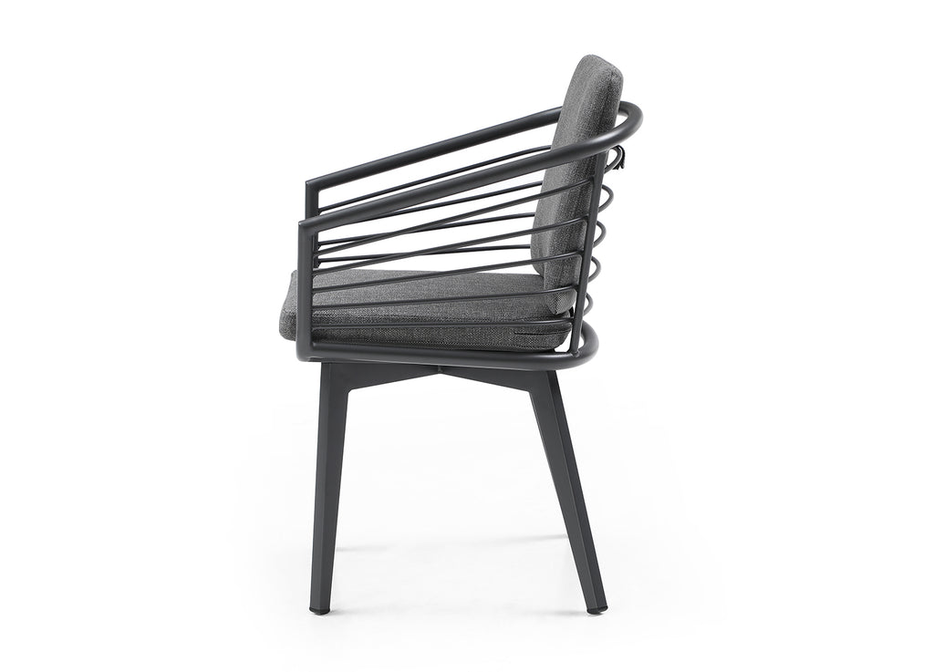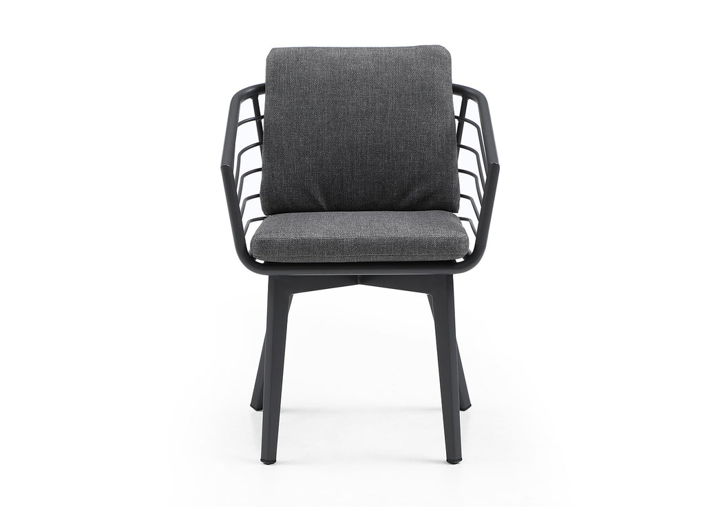 Kassey Outdoor Dining Armchair, Armrests and Legs in Dark Grey Powder-Coated Aluminium, Seat and Back in Dark Grey Fabric.