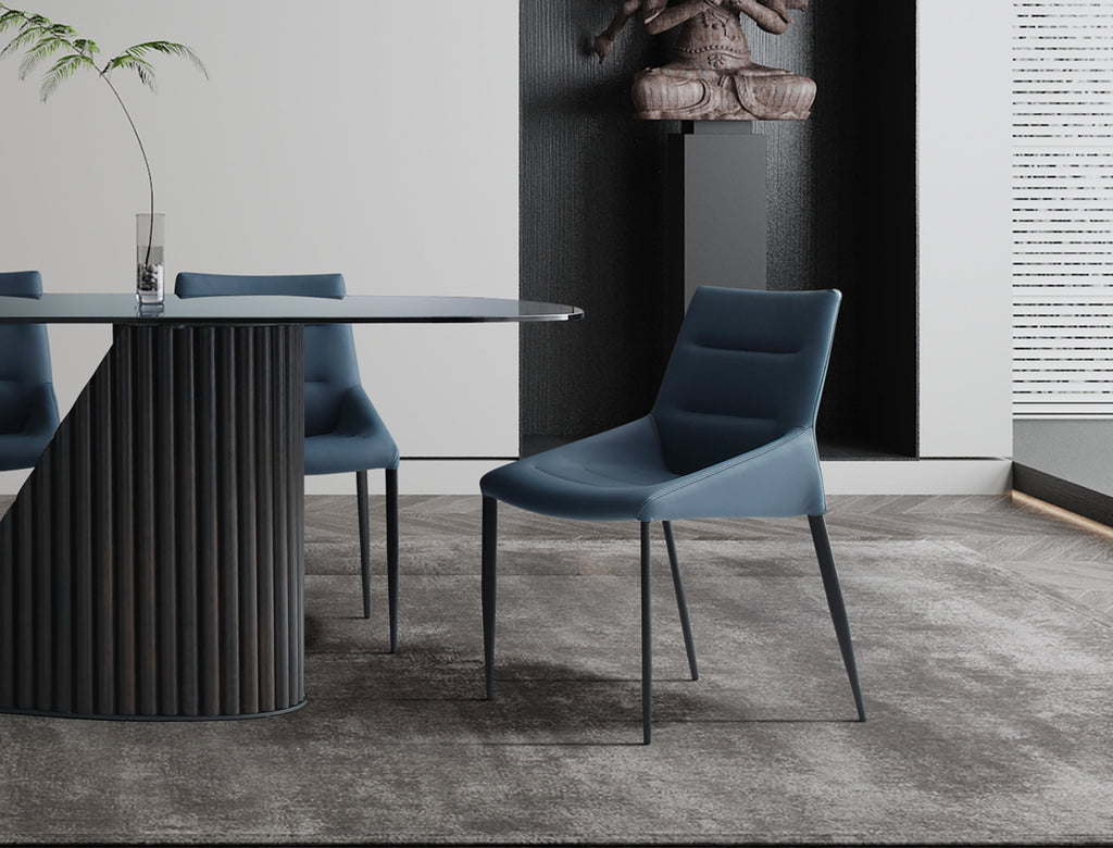 Kaya Dining Chair, Navy Blue Faux Leather, Sanded Black Powder-Coated Legs.
