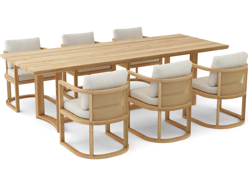Enjoy the comforts of outdoor dining with the Junus Dining Table Set. Featuring One Junus Dining Table and Six Dining Armchairs it’s made of premium unfinished teak and synthetic wicker. The Junus Dining Table measuring 8½ feet wide by 3 ¼ feet in depth is a sturdy and well-built teak outdoor dining table for the home or yard. It fits six Junus Dining Armchairs, expertly crafted and shaped to exquisite design. Chairs include 2 ½” thick All-Weather Sunbrella Fabric Cushions and Pillow ensuring a relaxing and most comfortable dining experience.