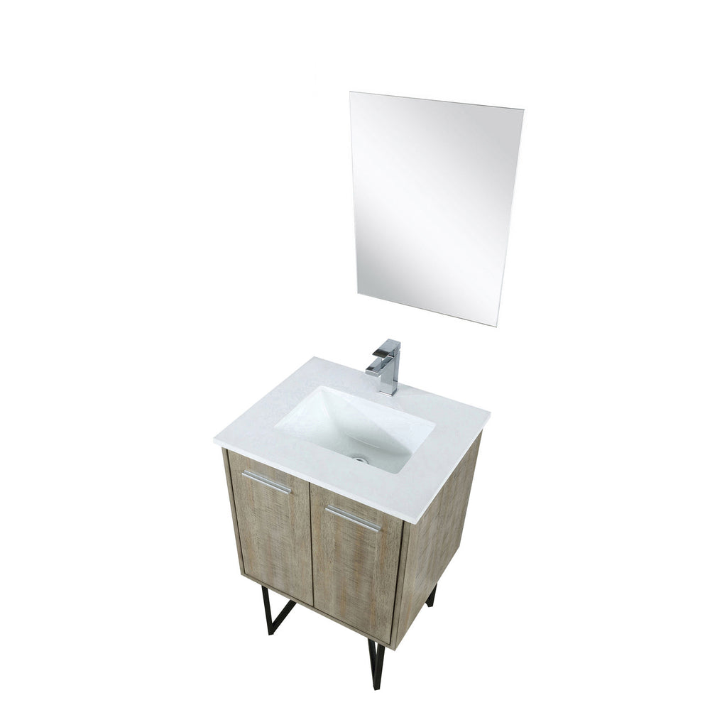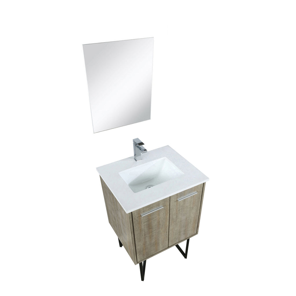 Lexora Lancy 24" Rustic Acacia Bathroom Vanity, White Quartz Top, White Square Sink, Balzani Gun Metal Faucet Set, and 18" Frameless Mirror LLC24SKSOSM18FGM