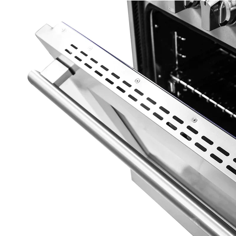 The Forno 30” Massimo Gas Range brings professional styling and quality into your home kitchen with its durable stainless-steel design. Cooktop has 5 sealed burners with a total stove top output of 68,000 BTU including 1 sealed dual-ring burner for simmering delicate tasks like melting chocolate or cooking sauces, giving you the ability to cook up whatever delicious meals you desire. The heavy-duty continuous cast iron grates allow for even heat distribution and maximum stability of cookware mobility over a recessed enamel cooktop cavity which keeps spills and splashes contained and easy to clean.