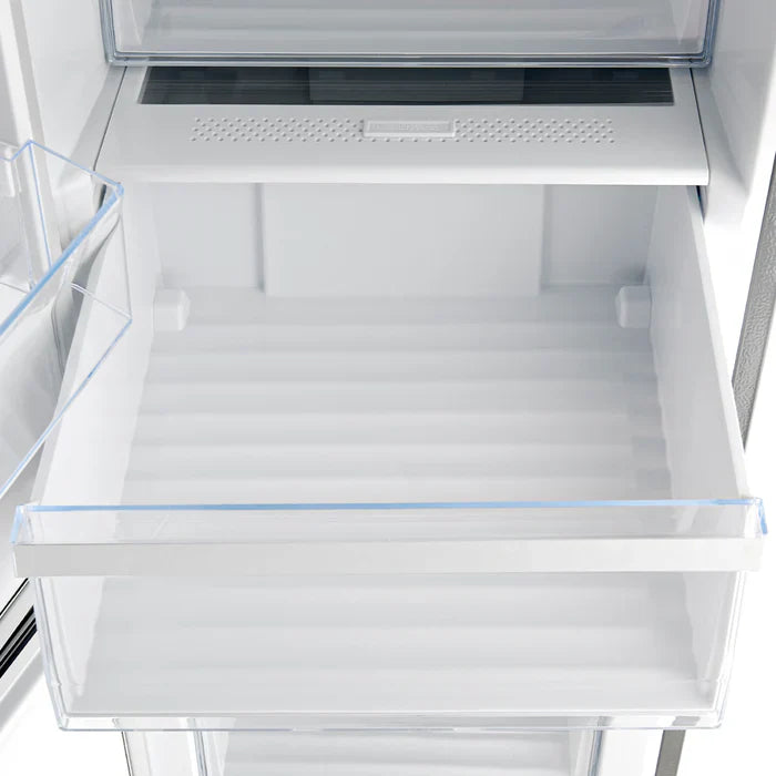 The Forno Guardia 23.4-inch bottom freezer refrigerator combines style and functionality with its compact design, making it ideal for smaller kitchens or even back kitchens. Its sleek stainless steel appearance ensures that it seamlessly blends into your kitchen decor. With a total storage capacity of 10.8 cu.ft., the fresh food compartment provides 7.4 cu.ft. of space, complete with three glass shelves, a deli drawer, and a humidity control crisper drawer.
