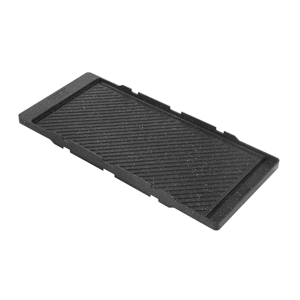 The cooktop has five sealed burners and a total output of 70,000 BTU. The griddle is reversible and has continuous cast iron grates.