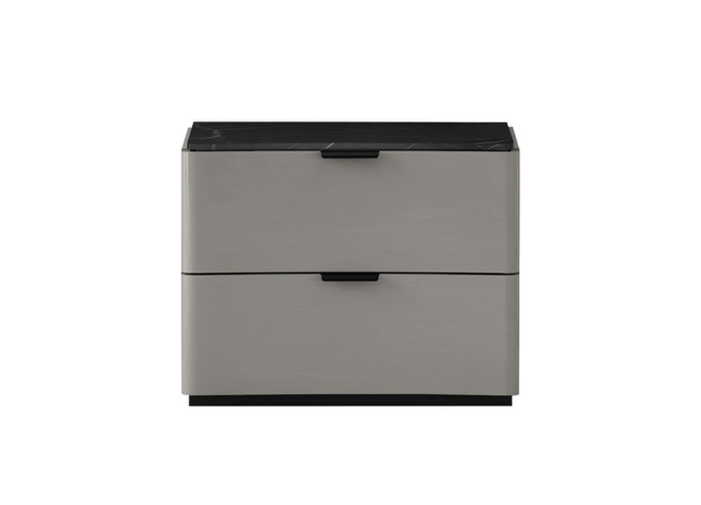 Massimo Nightstand, Available in Matt Dark Grey Lacquer or in High Gloss Light Grey Lacquer, Top in Black and White Marble Texture Lacquer, 2 Self-Closing Drawers and Matt Black Handles.
