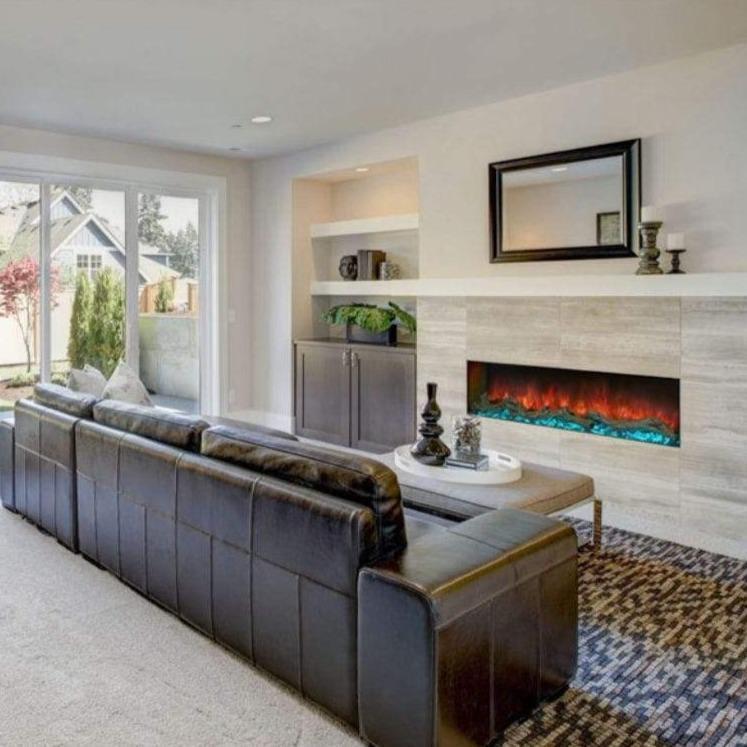 The modern flames fireplace is the perfect living room electric fireplace or for your bedroom in general and features removable side panels and custom installations. It can now range from a right corner, left corner, or bay application with seamless glass edges. The modern flames landscape pro electric fireplace features a true edge-to-edge viewing area for a unique frameless design.
