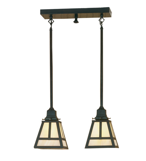 This handsome Craftsman styled Pendant is inspired by the Arts and Crafts movement. This fixture features 2 Beige Iridescent Glass shades with a striking Mission straight line design and complemented with Solid Brass hardware and decorative accents highlighted in a Craftsman Brown finish. The fixture is perfect for illuminating a broad range of interior spaces including islands, counters, and tables. The pendant is handcrafted by highly skilled artisans in our 180,000 square foot manufacturing facility in Yorkville, New York. Custom sizes, styles, colors and dimmable energy efficient lamping options such as LED are available. The 17-inch long fixture is UL and cUL listed for dry and damp locations.
