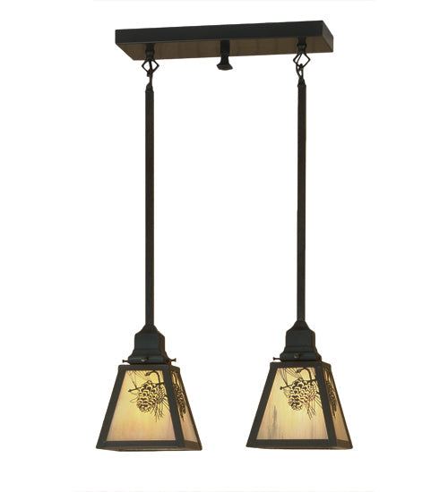 Pine Cone laden branches accent this handsome American Craftsman two light pendant. The fixture, handcrafted in the USA by Meyda artisans, is finished in Craftsman Brown and has Iridized Beige art glass panels.