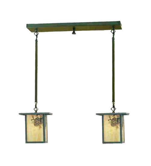 Pine Cone laden branches accent this handsome American Craftsman lantern style two light pendant. The fixture, handcrafted in the USA by Meyda artisans, has an Antique finish and has Beige glass panels.