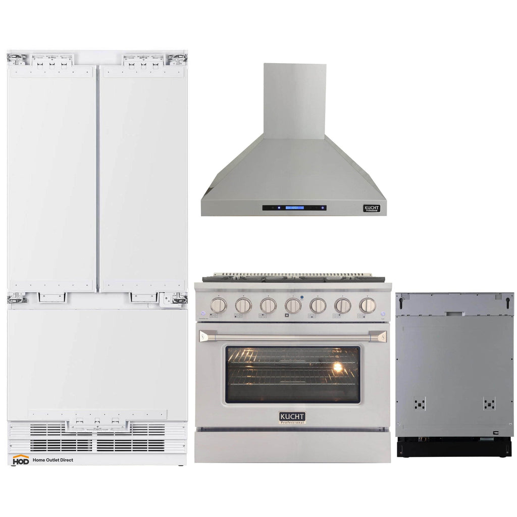 Kucht 4-Piece Appliance Package - 36" Gas Range, 36" Panel Ready Refrigerator, Wall Mount Hood, & Panel Ready Dishwasher