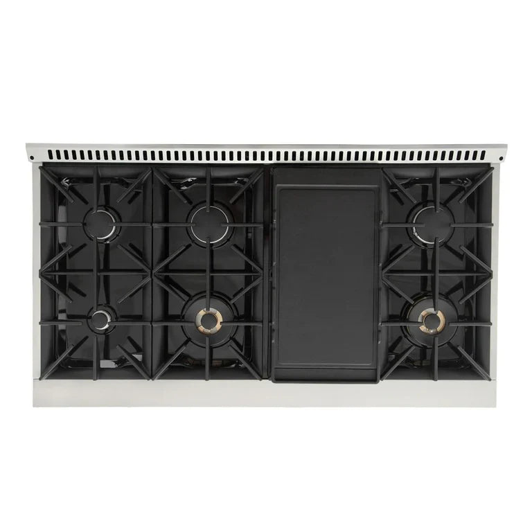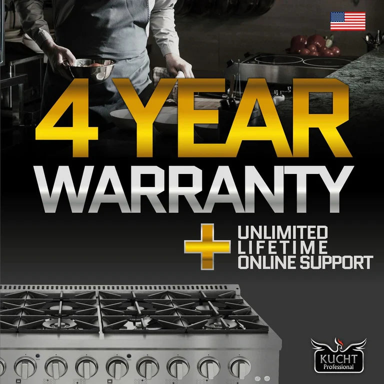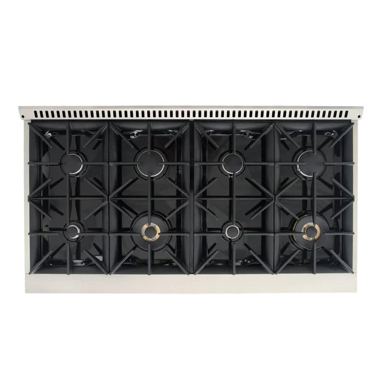 This 48" Freestanding Gas Range by Kucht offers 8 sealed burners and 6.7 cu. ft. of the total capacity oven. The range features a manual convection cooking mode, tube burner broiler, blue porcelain oven interior, and black porcelain top.