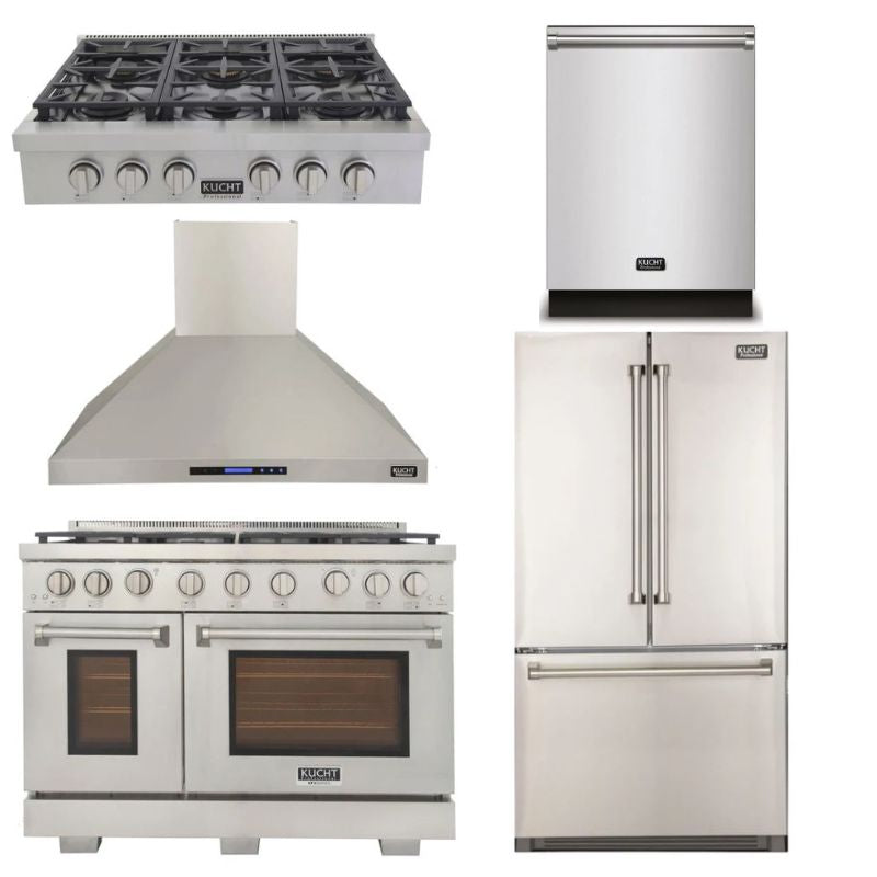 If so, our Kucht Appliance Package - 48 inch Natural Gas Range in Stainless Steel, Wall Range Hood, Refrigerator, Dishwasher, and Gas Stovetop, KFX-KFX480-369T is perfect for you!