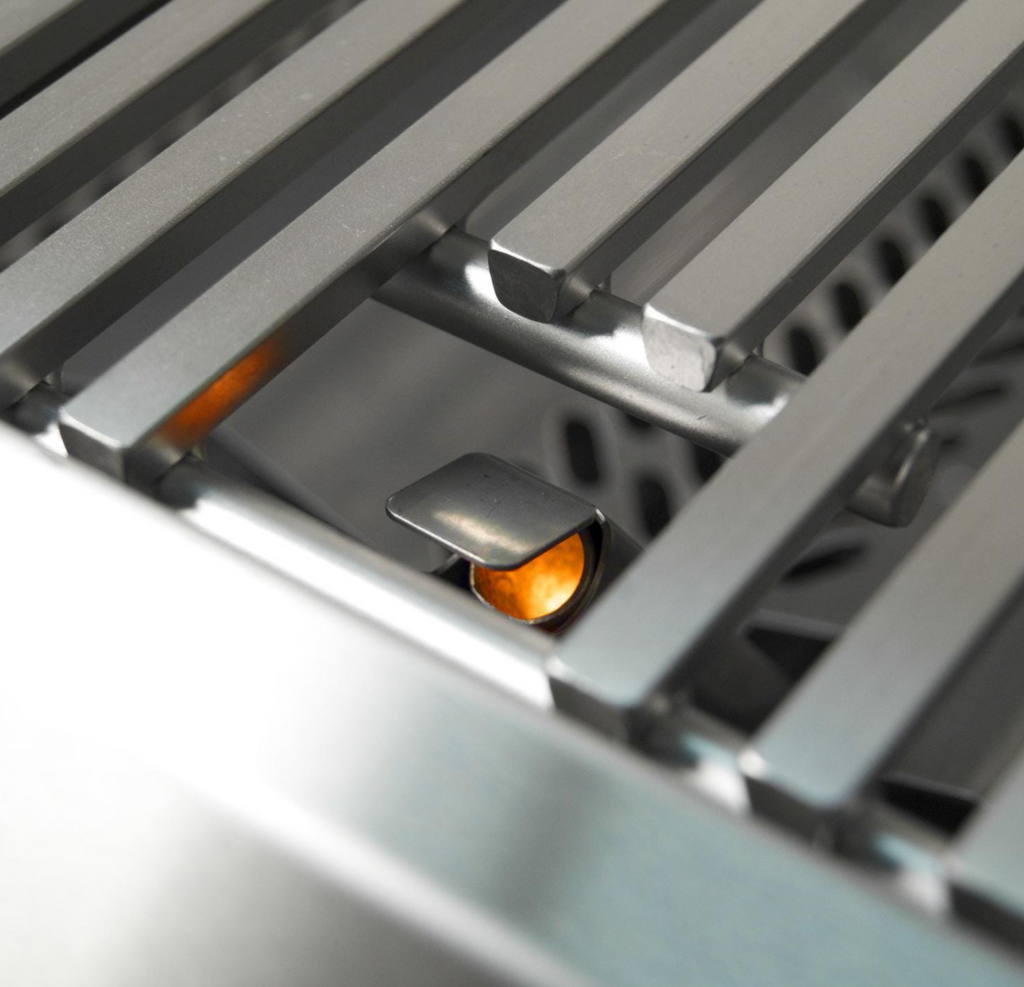Flash tubes serve as a backup. Flavor grids sit above the burners to spread heat evenly and protect the burners from debris and grease. The cooking surface consists of the patented Diamond Sear cooking grids. These grids feature a matte, non-stick surface, and a trapezoidal shape that efficiently transfers heat from the burner to the wide surface of the cooking grids.