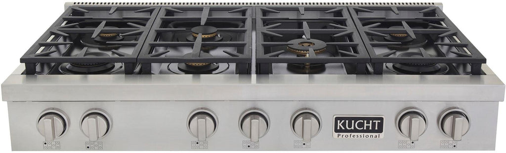 48" Professional Stainless Steel Rangetop by Kucht comes with 7 Sealed Burners and features Black Porcelain Top, Heavy Duty Cast Iron Grates, Electronic Ignition and Auto-Reignition.