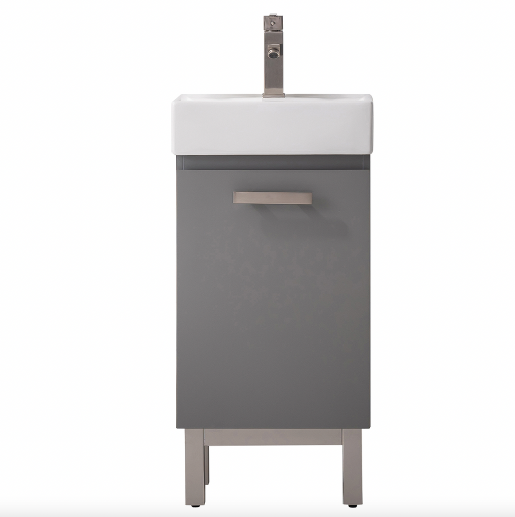 The Stella vanity is compact in size, yet it features a generously sized basin and wood cabinet with plenty of storage place. Whether you choose to wall mount the cabinet as a floating vanity, or use the included aluminum finished wood legs as a free standing vanity, the results will be equally pleasing. The porcelain integrated sink is both beautiful and low maintenance, and the concealed adjustable hinges will insure a soft and quite closing of the cabinet door every single time. Mirror, faucet, and drain are not included.