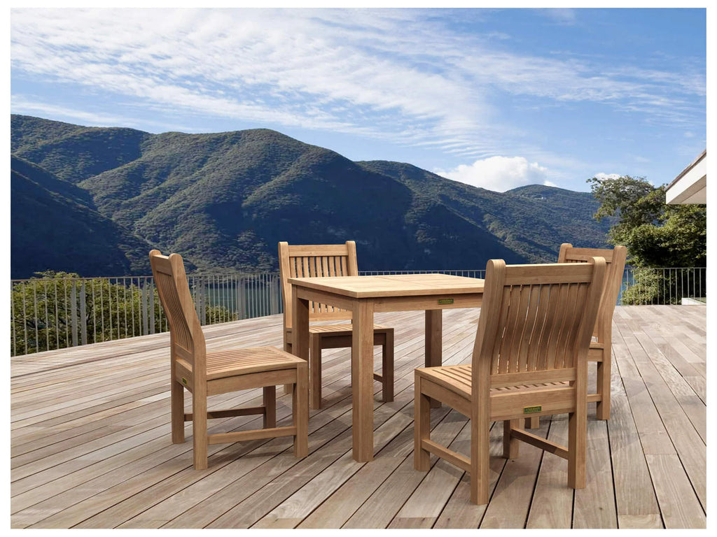 Enjoy the beauty of your backyard and the pleasure of outdoor dining with the Bahama Dining Table and Sahara Dining Chairs. This set includes a 35″ Bistro Square Table that fits four people comfortably and four Sahara Dining Armchair featuring contoured back and seating for added comfort. Table and chairs all constructed using mortise and tenon joinery for strength and durability. Made of premium grade teak this set will provide decades of outdoor dining enjoyment with family and friends.