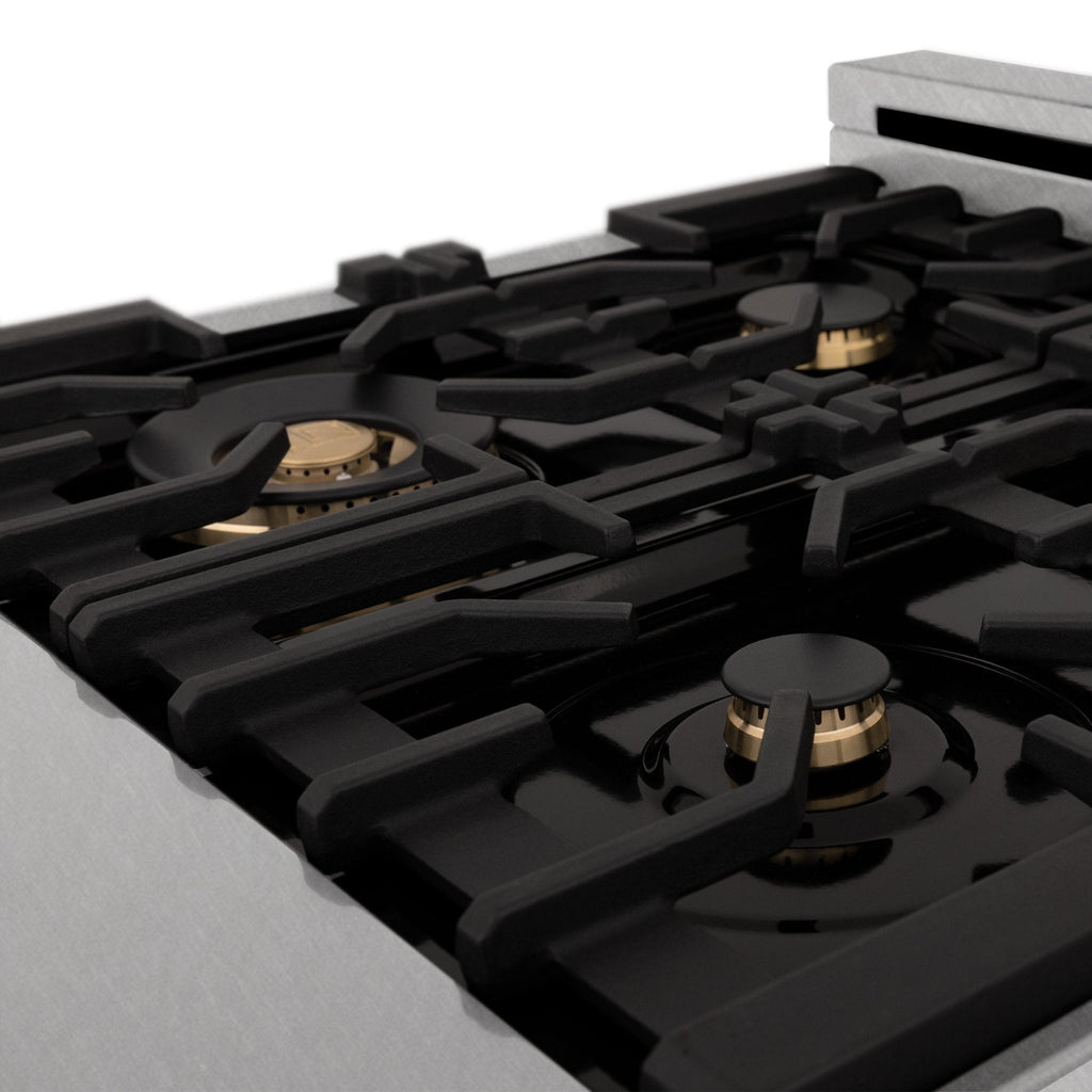• ZLINE's Italian brass burners give this range an elevated, timeless pop of color while providing enhanced cooking benefits such as superior heat retention and even flame distribution.
