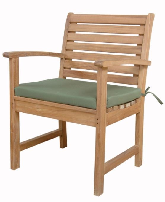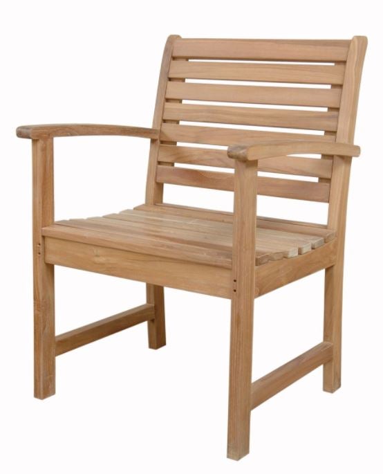 Back to Nature with Victoria dining armchair. The simple traditional style dining chair with horizontal slats for the back and seat will never go out of style. This is a beautiful and functional piece of furniture for your patio or terrace. Place this chair in your backyard with the dining table, will amazed your family or friends. The seat and back has a curve design which make sitting more comfortable and enjoyable. Made from the finest plantation solid teak wood, kiln dried, mortise tenon construction. Cushions (optional) are made of Sunbrella fabric, a water repellent material, preventing mildew and fading. Some assembly required. Instructions and all necessary parts included.