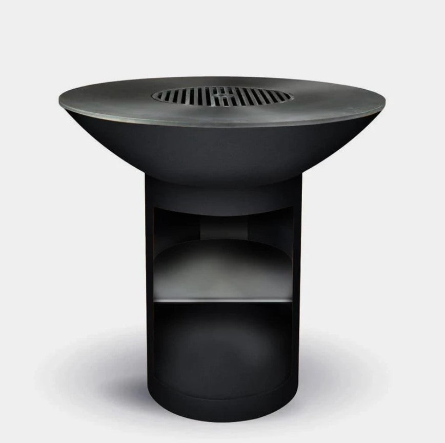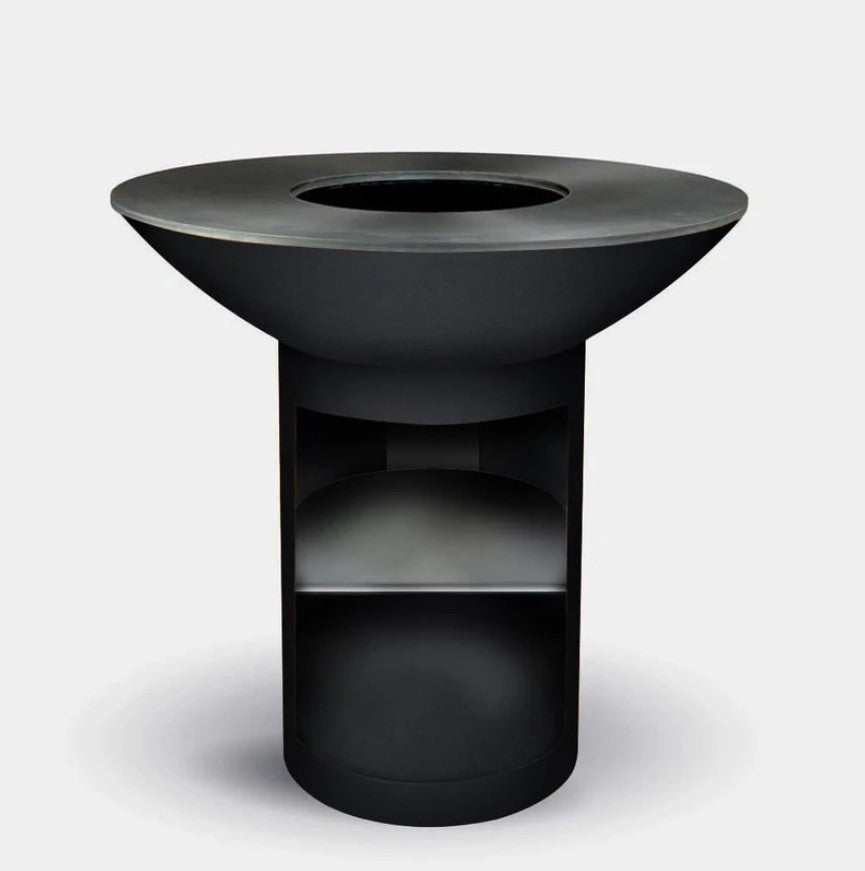 The Arteflame Classic 40" grill with a tall round base is available with storage.  It has the same sleek look with outstanding functionality.  Building a wood or charcoal fire in the center of the grill, the cooktop heats from the center out. This heat pattern results in higher cooking temperatures closer to the outer edges so various foods can be cooked at various temperatures simultaneously. When not in use as a grill, Arteflame can also be enjoyed as a fire bowl with the cooktop on or off, providing warmth and a social and serene ambiance.