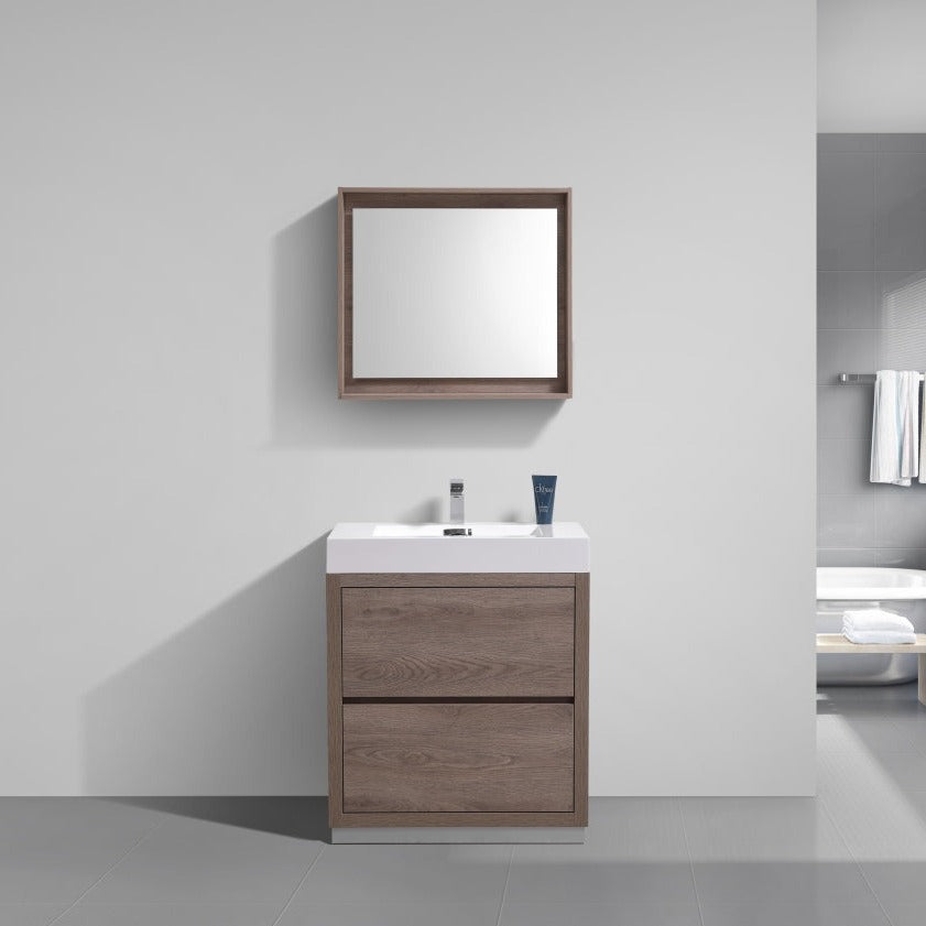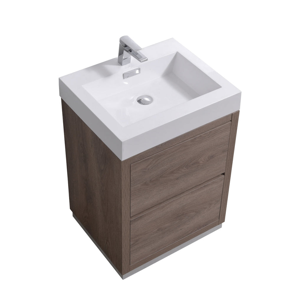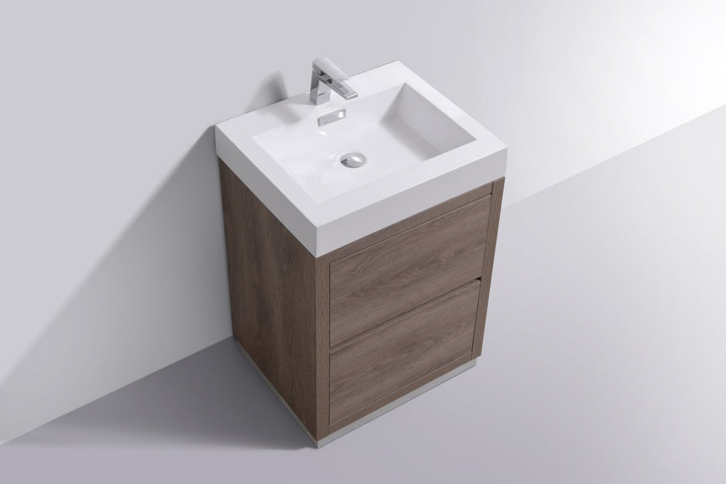 The Bliss is one of the most elegant modern Bathroom Vanities around.  This 24-inch model comes with a reinforced Acrylic composite sink, Marine Veneer Constructed Console that is fully moisture and waterproof, with high-quality European  Hardware that provides easy click, Push-Open drawers.