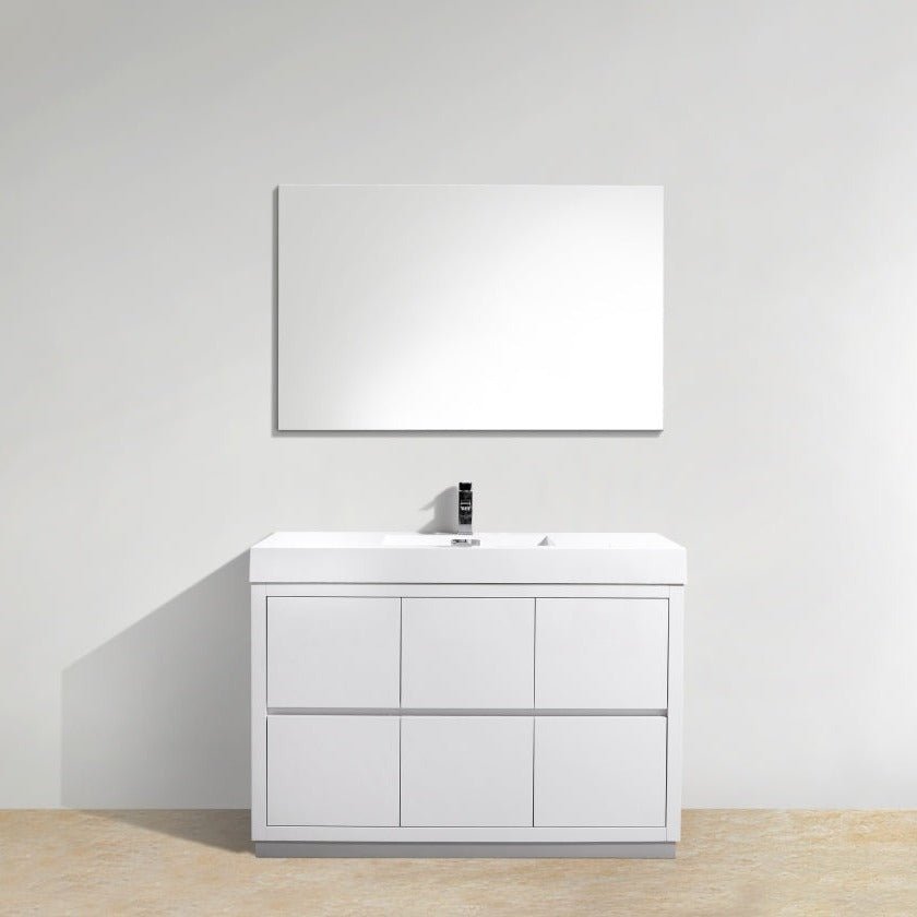 The Bliss is one of the most elegant modern Bathroom Vanities around.  This 48-inch model comes with a reinforced Acrylic composite sink, Marine Veneer Constructed Console that is fully moisture and waterproof, with high-quality European  Hardware that provides easy click, Push-Open drawers.