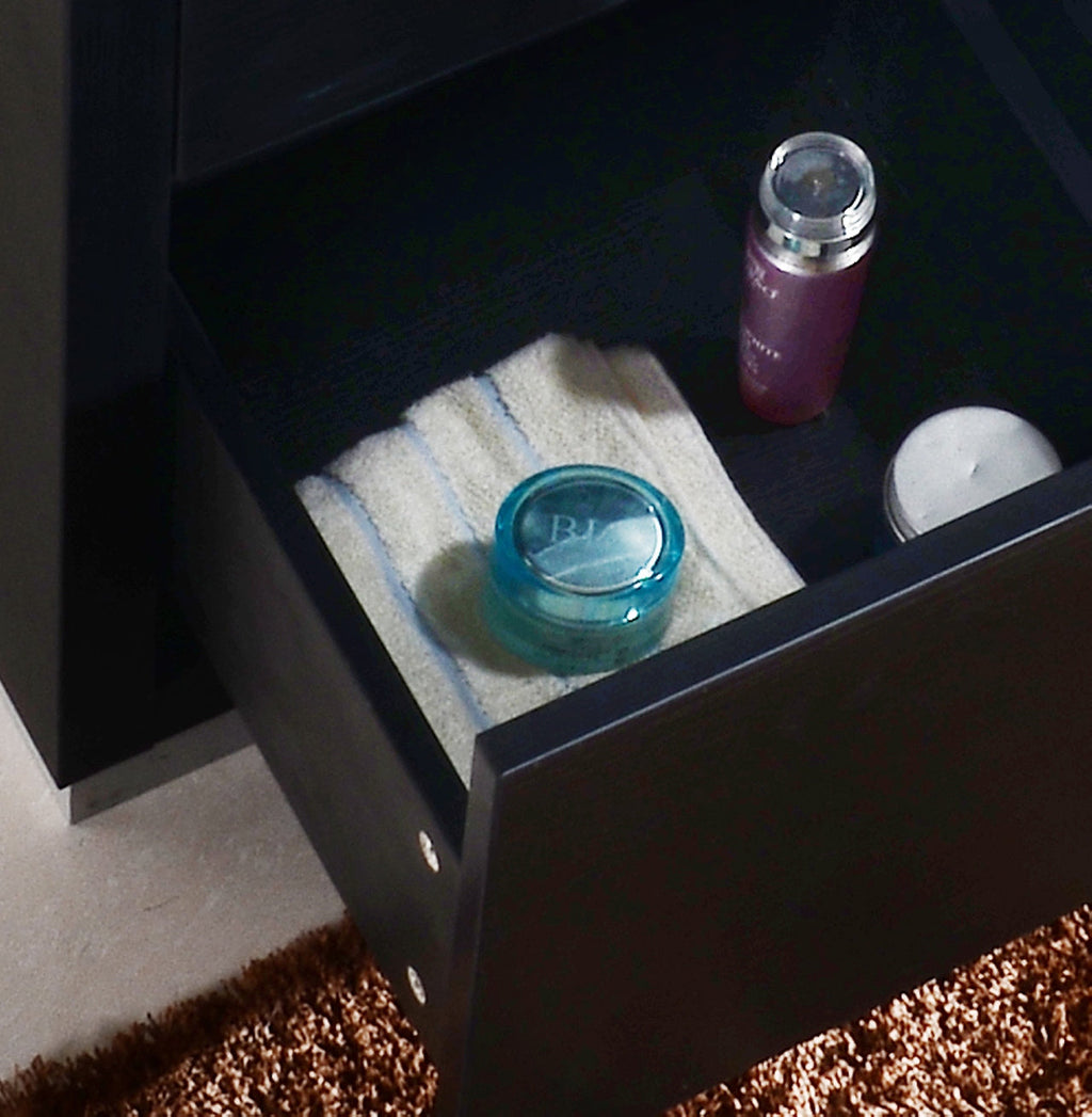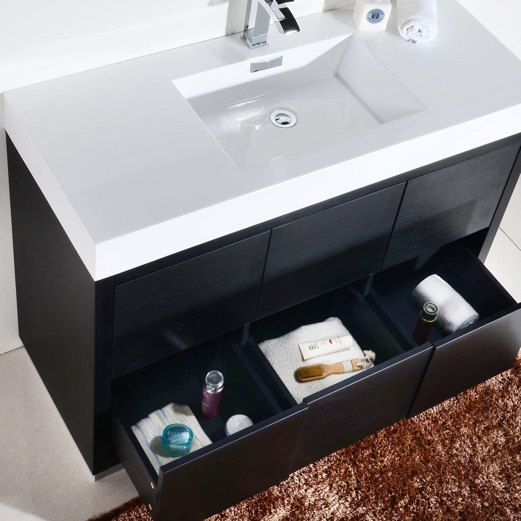The Bliss is one of the most elegant modern Bathroom Vanities around.  This 48-inch model comes with a reinforced Acrylic composite sink, Marine Veneer Constructed Console that is fully moisture and waterproof, with high-quality European  Hardware that provides easy click, Push-Open drawers.
