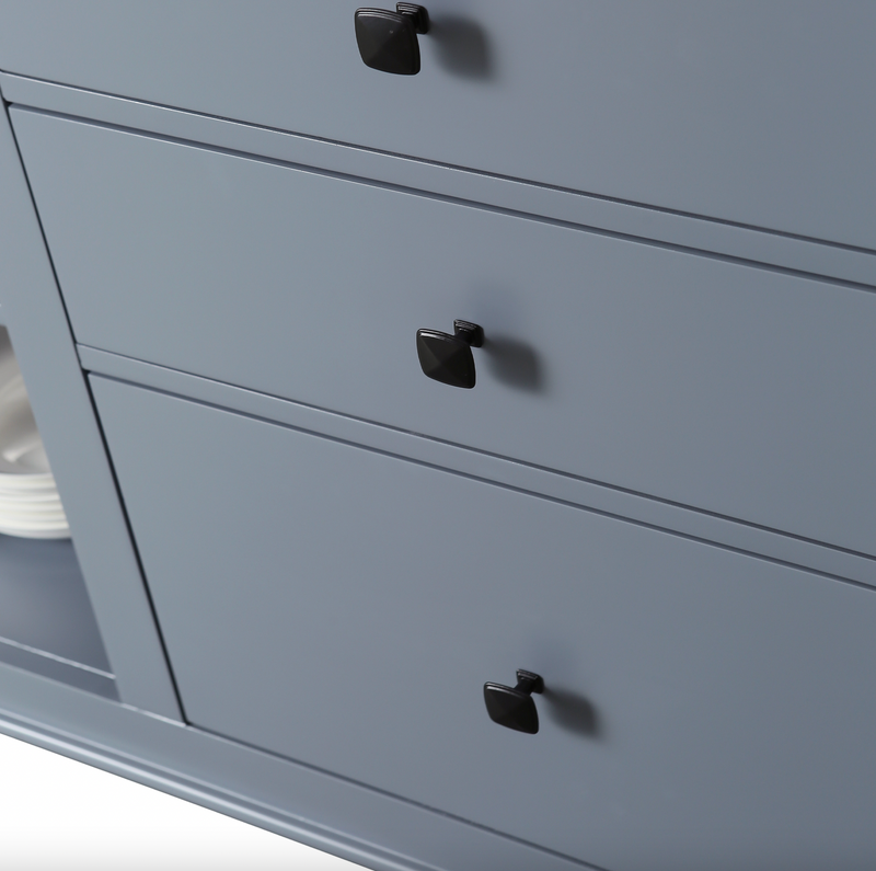 The 54" x 28" footprint of this island is perfect for small to medium sized kitchens. A table measuring 48" wide can slide out and be used for additional counter space and dining when needed. Simply slide the table back in when not in use to maximize your floor space. 3 soft closing drawers, ample shelf space, and natural finished solid hardwood countertop make this multi-functional island the perfect centerpiece for your kitchen.