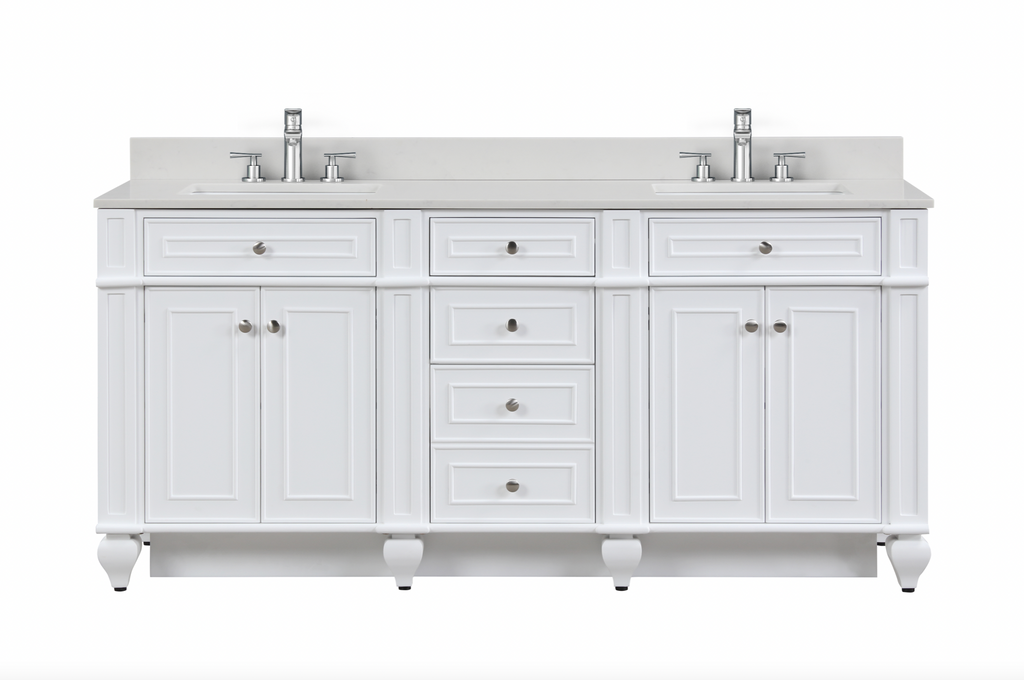 All Winston vanity cabinets are constructed from solid birch hardwood and paired with a .75 inch thick antique white quartz countertop and backsplash that is both beautiful and low maintenance. Soft closing doors and drawers provide smooth and quiet operations, while brushed finished metal hardware provides the perfect finishing touch. Other fine details include white porcelain sinks with overflow, dovetail joint drawer construction, toe kick, predrilled holes to accommodate 8-inch widespread faucets, and multi-layer paint finish on the cabinets provide beauty and durability for years to come. Mirrors, faucets and drains are not included.