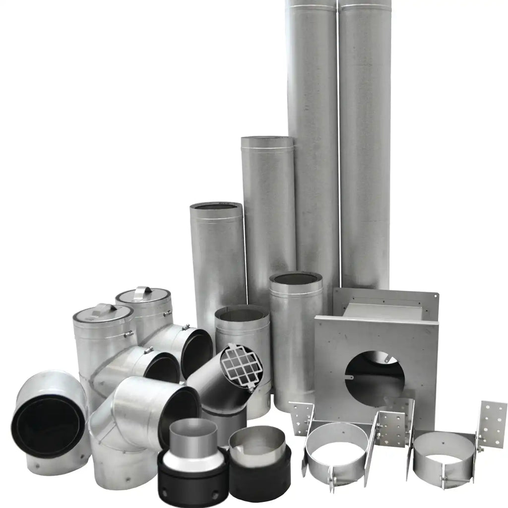 Includes: one stove connector, one 3" to 4" increaser stove connector, one 12"L pipe, one 18"L pipe, one 24"L pipe, two 36"L pipe, one 9"L slip adjustable section, one wall pass-thru, two tees, two 90° elbows, two wall supports and one jet cap.