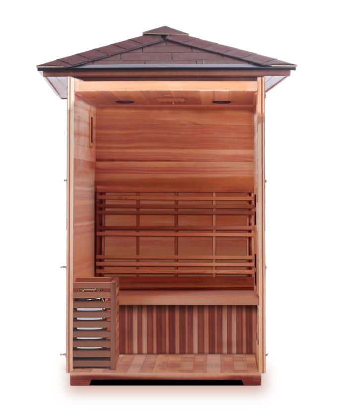It seats 2 people in a well-crafted interior that is designed to be enjoyed in solitude or with someone. As a MoonLight model, the design of this sauna is aimed at creating a feeling of calm. Unlike the Rustic model, this sauna favors wood over the glass for a wholesome traditional experience.