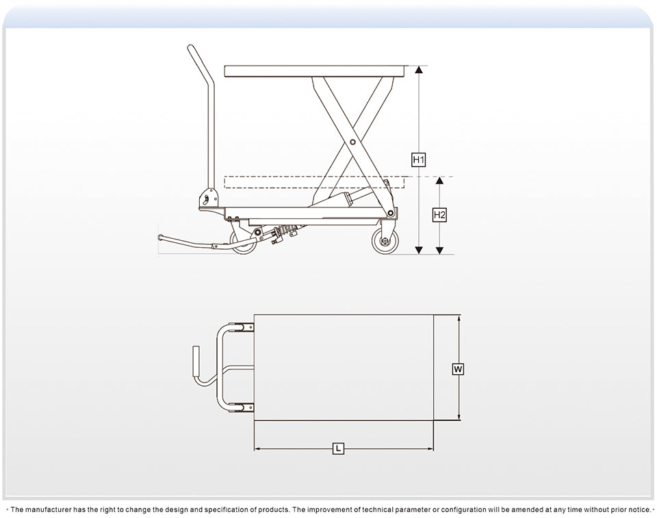 Eoslift USA Heavy Duty Industrial Grade TA50 Scissor Life Table Cart. The load maximum is 1100 lbs., and it has a 35.8 in. raise height. The table measures 20.5 x 39.7 in. and is made of reinforced robotic welding to lift the heaviest items. It also features polyurethane wheels to complete any loading project.