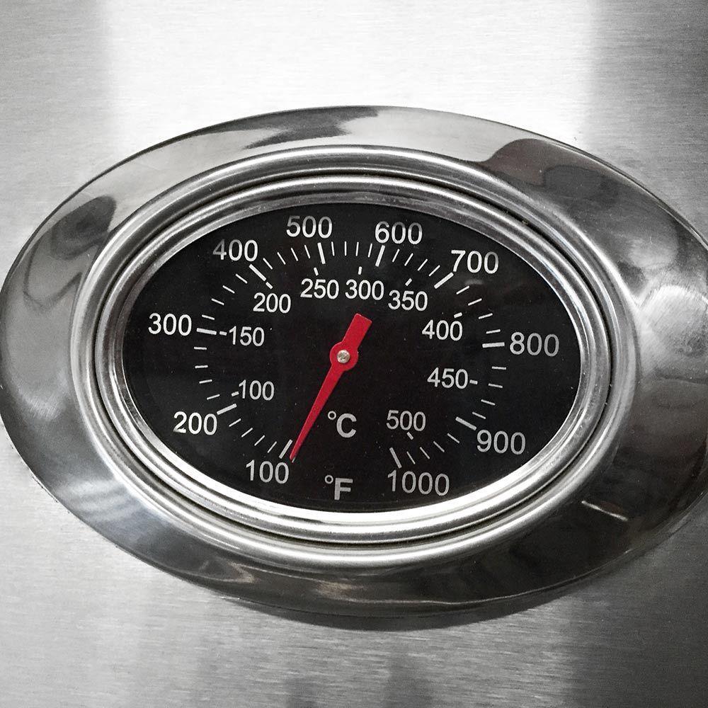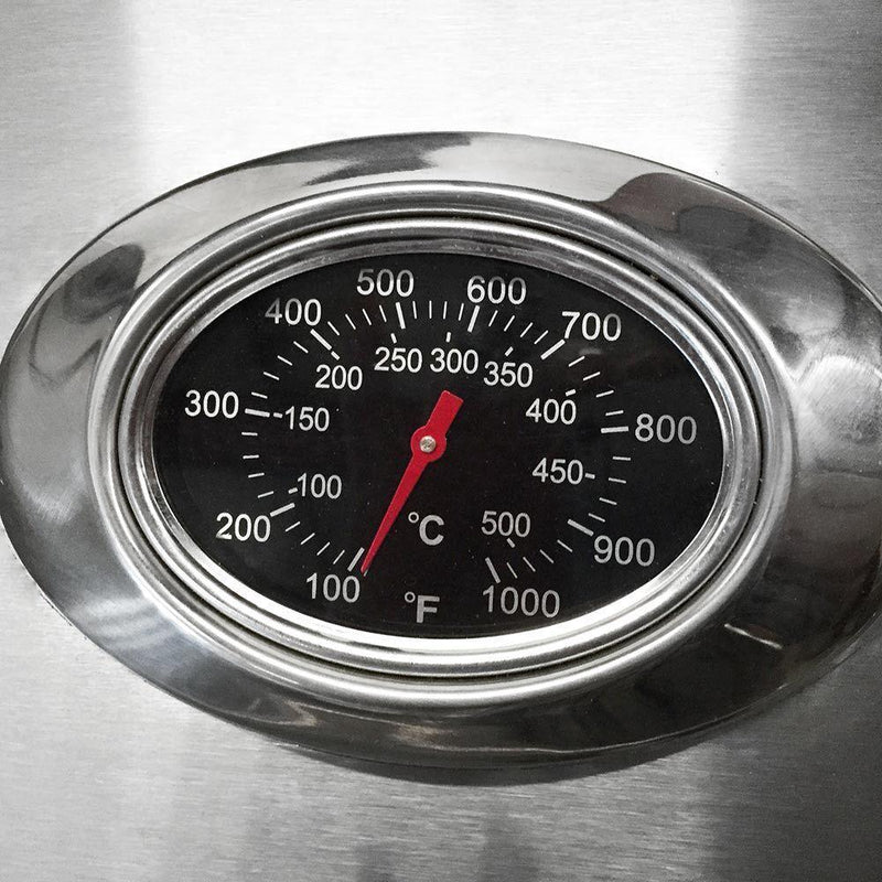 An analog thermometer with polished stainless steel bezel is embedded in the hood. It is large and attractive with a forward angle for easy viewing.