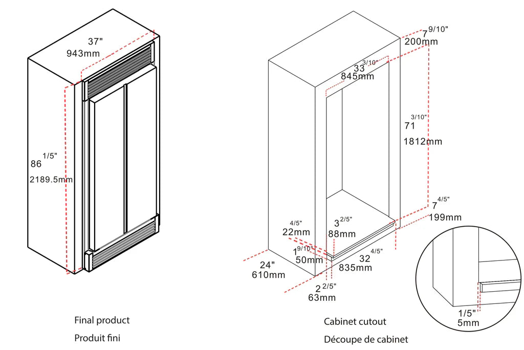 FORNO Salerno 33" Side by Side Built-in Refrigerator 15.6 cu.ft in Stainless Steel with Built-in Style Grille Trim Kit - FFRBI1805-37SG