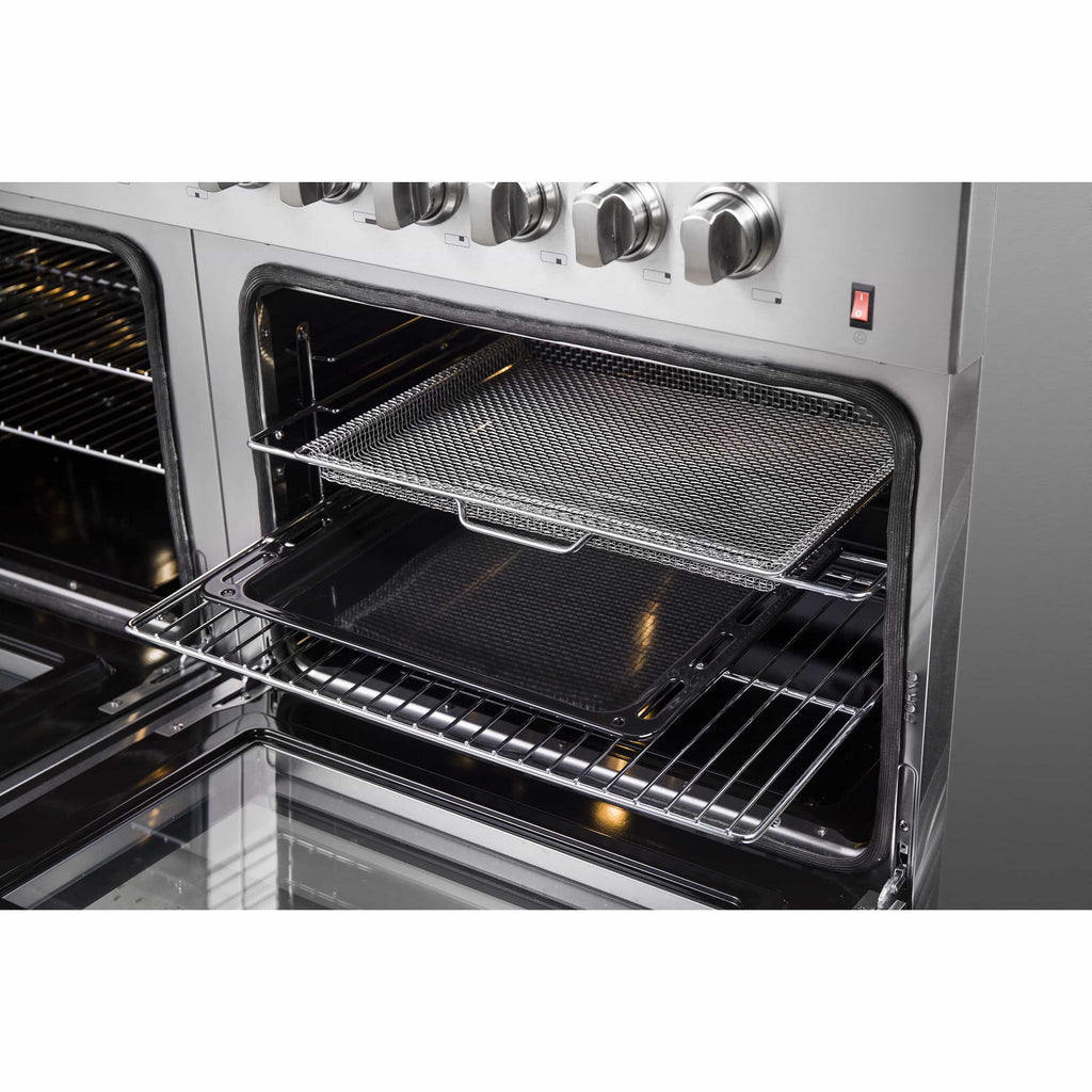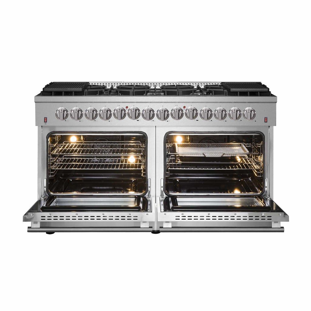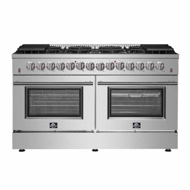 The 60” Galiano Dual Fuel Range brings professional styling and quality into your home kitchen with its durable stainless-steel design. Cooktop has 10 sealed burners with a total stove top output of 142,000 BTU. This unit is ready to handle all your pots and pans with ease over it’s continuous cast-iron grate design. The cumulative capacity 8.64 cu. ft. double electric ovens with a total output of 12,600 Watts are encased in a black enameled interiors with one oven fitted with an internal convection fan, ensures to achieve fast, precision and consistent oven cooking along for easy viewing are 3-layer glass oven door windows. Included are 4 electroplated oven racks, 2 reversible griddles, concave wok-ring and LP conversion kit. Housed in a high-grade stainless steel body and zinc coated metal knobs and bezels, this unit sports a stylish look that is built to last. All Forno products are backed by an iron clad 2-year warranty for your satisfaction. Skip the high price tags without sacrificing quality and performance. Lower the cost of living with Forno.
