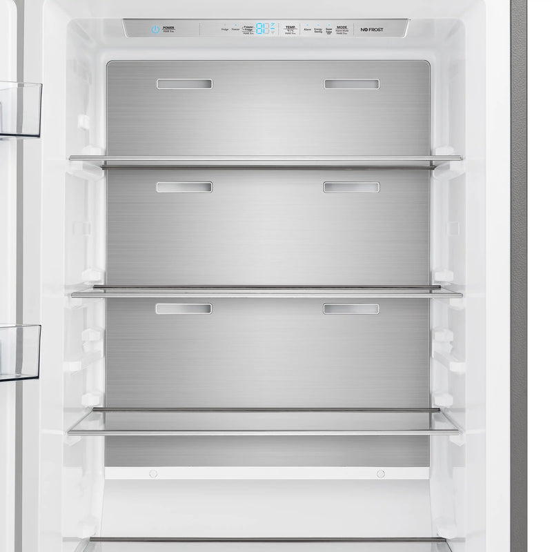 Elegant glass shelves with silver trim and practical plastic door balconies not only enhance the overall appeal but also offer efficient storage solutions. With the ℉/℃ Transform Ease feature, you can switch between Fahrenheit and Celsius effortlessly. Brilliant LED lighting illuminates the interior, making it a joy to locate your desired items. Three glass shelves and three plastic drawers with silver trim provide flexible storage options, catering to your everyday routine. Temperature settings are easily managed through the internal electronic touch control panel, ensuring your food stays at the perfect temperature. Durable and built to last, the VCM door panel and metal back guarantee longevity.