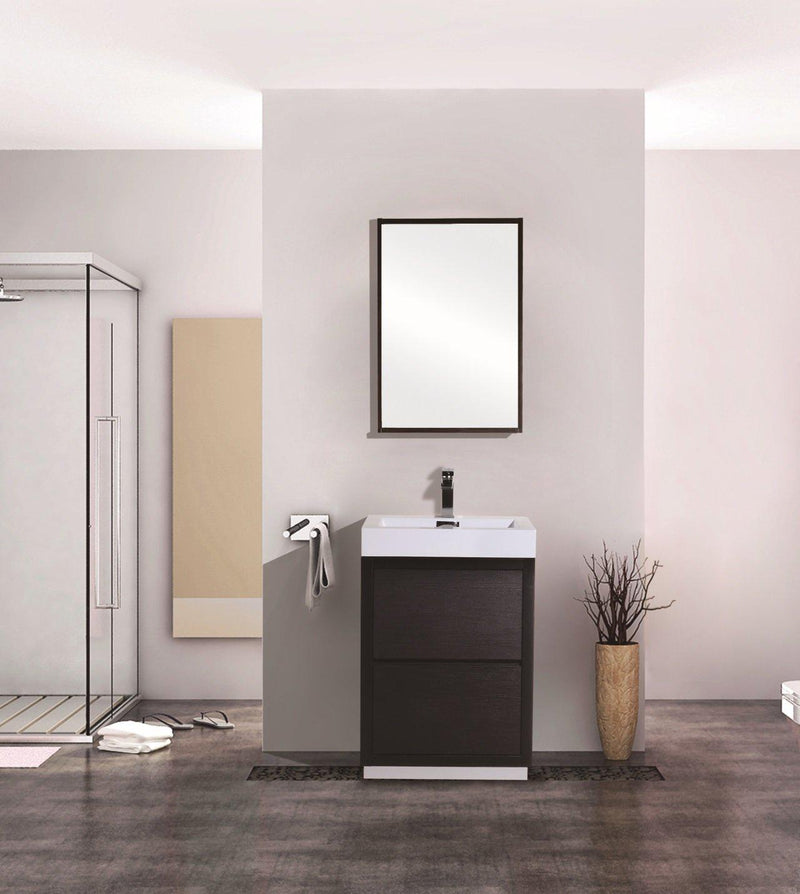 The Bliss is one of the most elegant modern Bathroom Vanities around. This 24 Inch model comes with a reinforced Acrylic sink, Marine Wood Veneer Constructed Console that is fully moisture and water proof, with high quality European Hardware, that provides smooth push-open operation drawers.