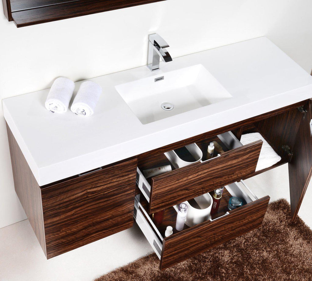 The Bliss is one of the most elegant modern Bathroom Vanities around. This 60 Inch model comes with a reinforced Acrylic sink, Marine Wood Veneer Constructed Console that is fully moist and waterproof, with high quality European Hardware, that provides smooth soft-closing operation drawers.