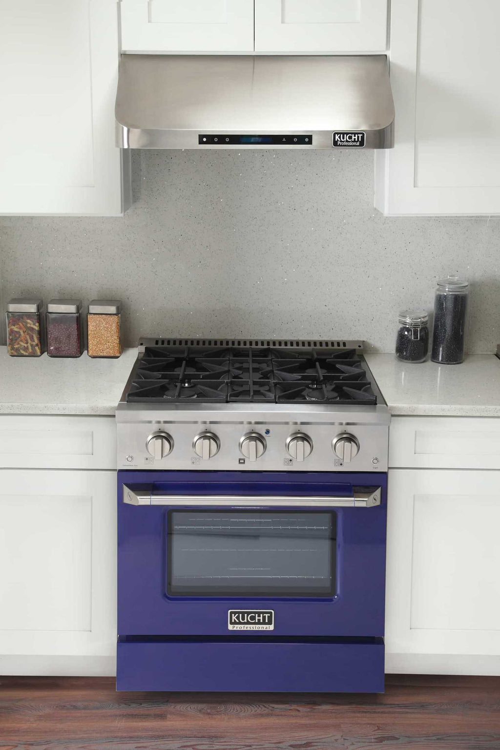 KUCHT Professional 30 in. 4.2 cu. ft. Dual Fuel Range with Sealed Burners and Convection Oven in Stainless Steel with Blue Oven Door.