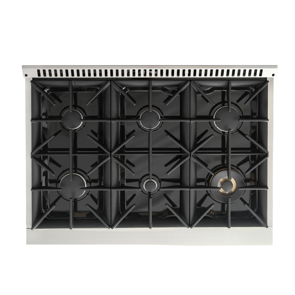 This 36" Freestanding Gas Range by Kucht offers 6 sealed burners and a 5.2 cu. ft. capacity oven. The range features manual convection cooking mode, tube burner broiler, blue porcelain oven interior and black porcelain top.