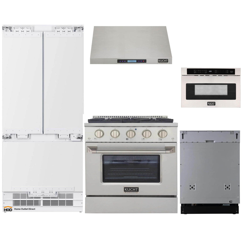 Kucht 5-Piece Appliance Package - 30" Dual Fuel Range, 36" Panel Ready Refrigerator, Under Cabinet Hood, Panel Ready Dishwasher, & Microwave Drawer