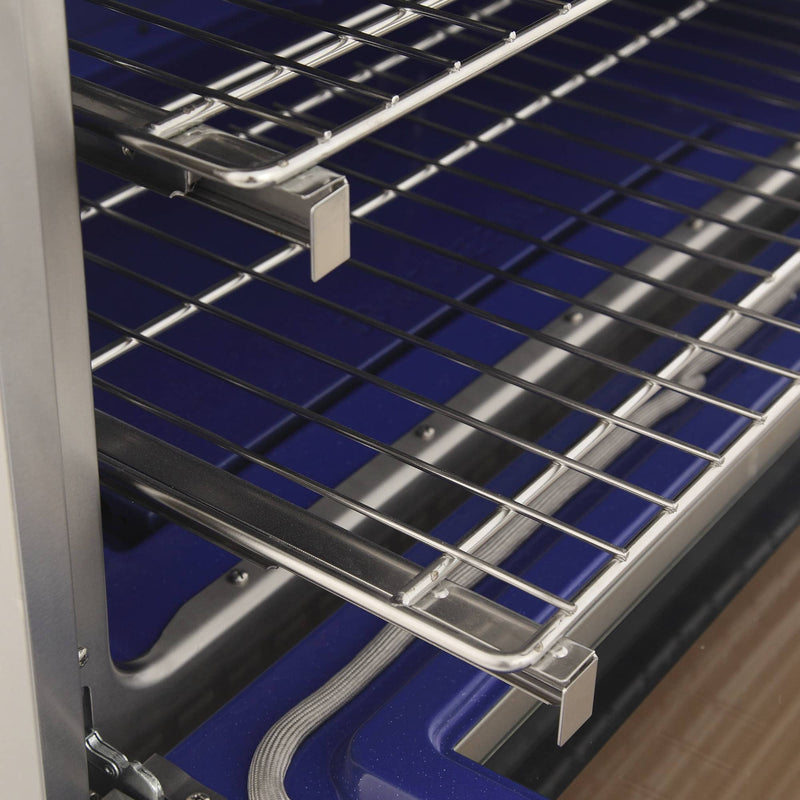 - Adjustable, telescopic, stainless steel shelves create ease of use and easy to clean oven
