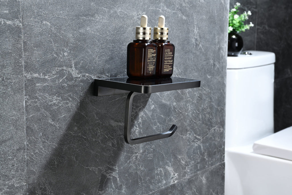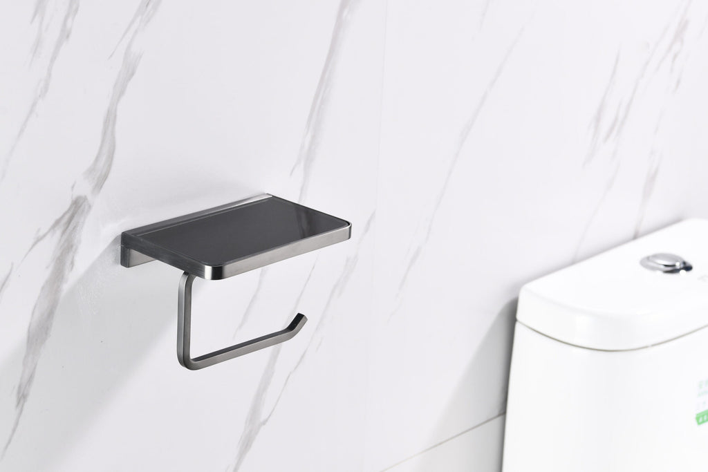 Lexora Bagno Bianca Stainless Steel Black Glass Shelf w/ Toilet Paper Holder - Gun Metal LSP18152GM-BG