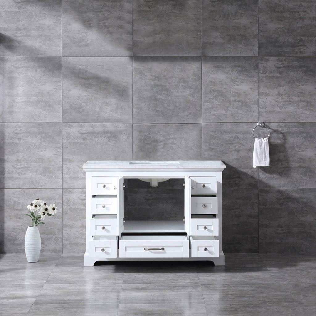 Lexora Dukes 48" White Single Vanity, White Carrara Marble Top, White Square Sink and no Mirror - LD342248SADS000
