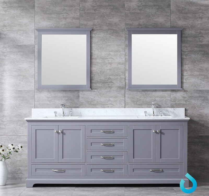 Lexora Dukes 80" Dark Grey Double Vanity, White Carrara Marble Top, White Square Sinks and 30" Mirrors LD342280DBDSM30