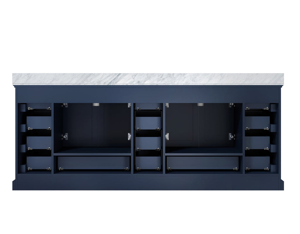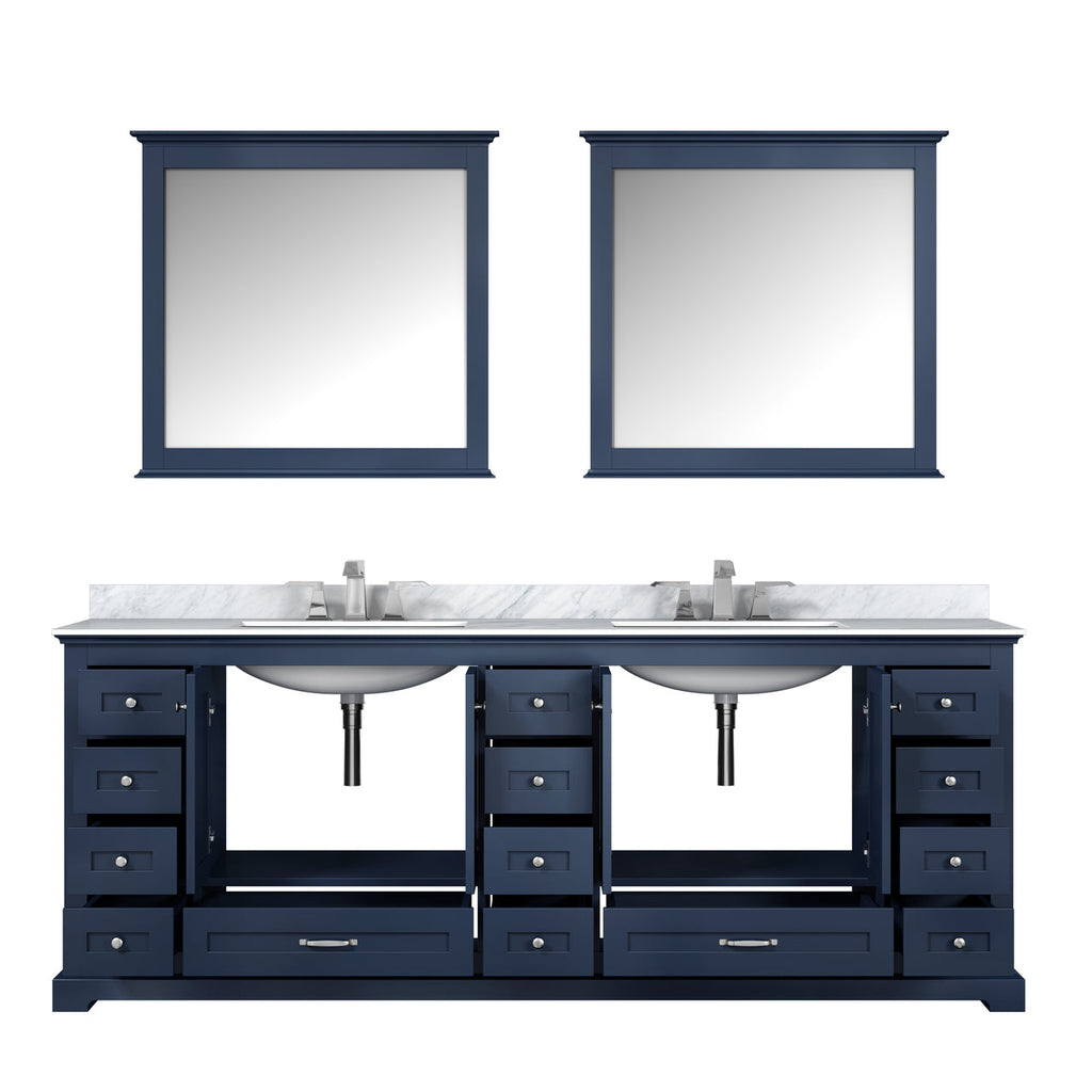 Lexora Dukes 84" Navy Blue Double Vanity, White Carrara Marble Top, White Square Sinks and 34" Mirrors LD342284DEDSM34