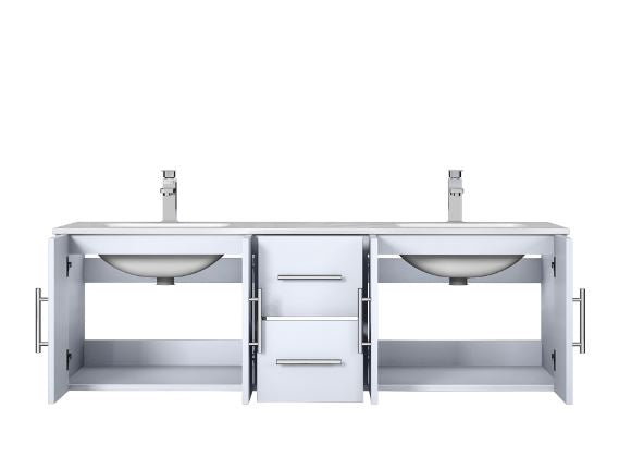The wall-mounted Geneva vanity in white from Lexora is a beautiful blending of postmodern style and sensible functionality. Its simple, box-like design is complemented by a countertop that lends hints of classical style. When mounted on the wall, the Geneva vanity leaves ample space beneath for additional storage—ideal for bathrooms with limited space.
