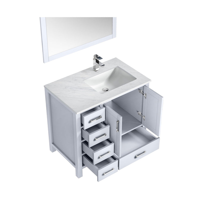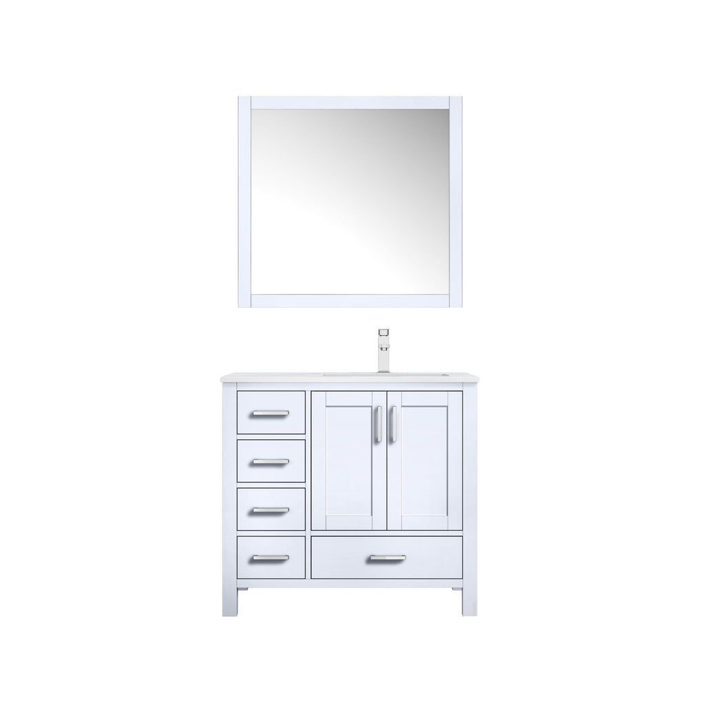 Lexora Jacques 36" White Single Vanity, White Carrara Marble Top, White Square Sink and 34" Mirror - Right Version LJ342236SADSM34-R