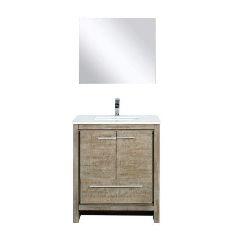 Lexora Lafarre 30" Rustic Acacia Bathroom Vanity, White Quartz Top, White Square Sink, Labaro Brushed Nickel Faucet Set, and 28" Frameless Mirror  LLF30SKSOSM28FBN