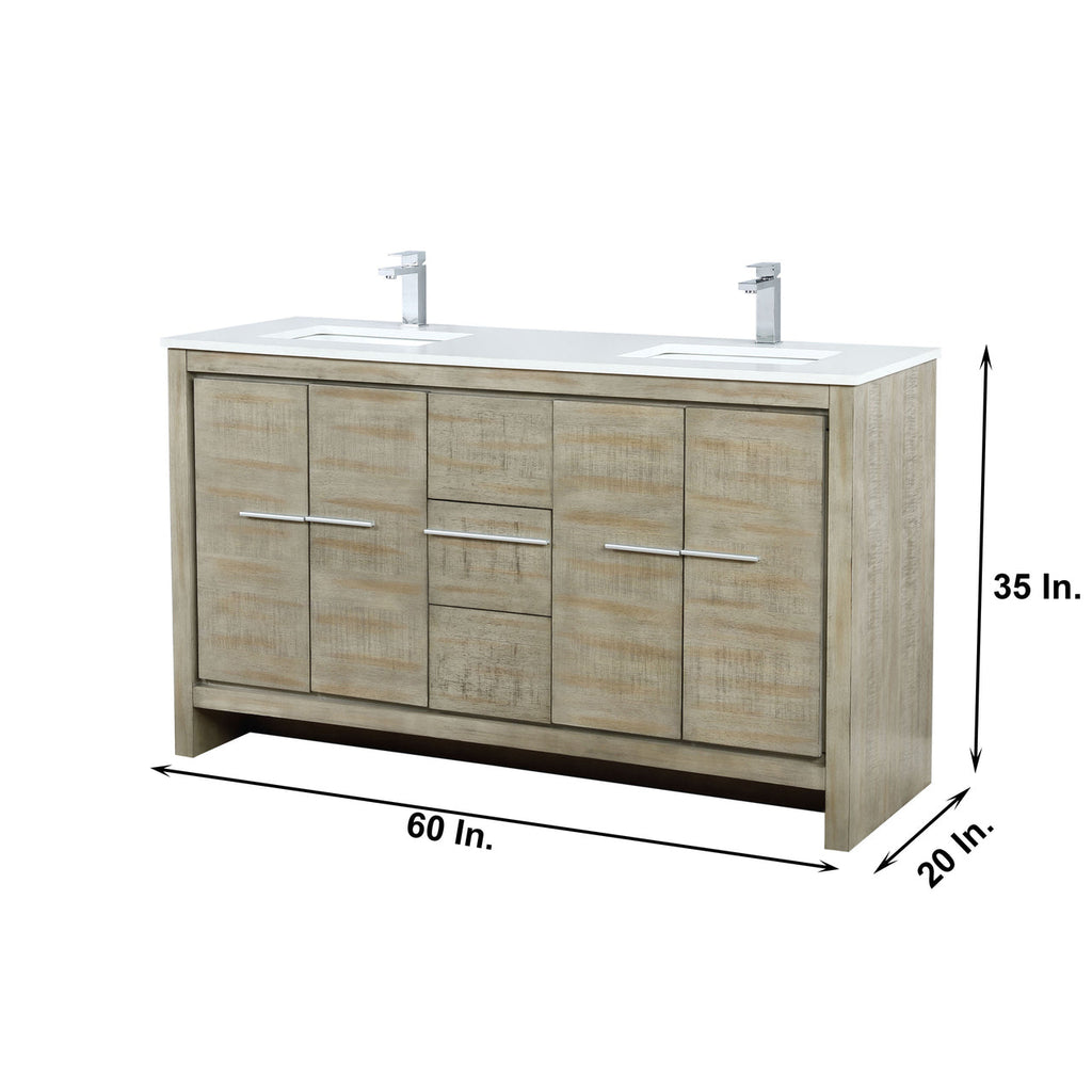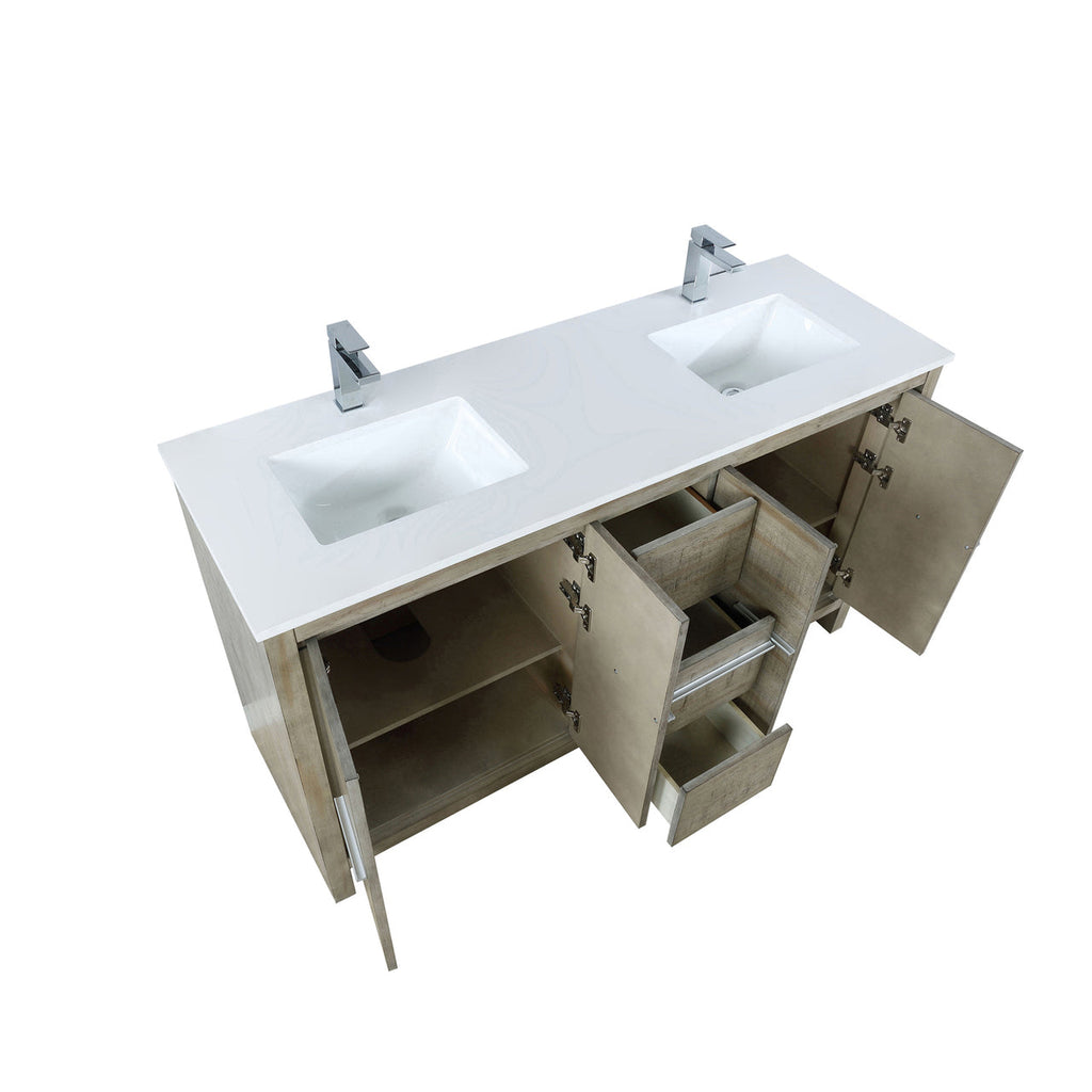 Lexora Lafarre 60" Rustic Acacia Double Bathroom Vanity, White Quartz Top, White Square Sinks, and Balzani Gun Metal Faucet Set LLF60DKSOD000FGM