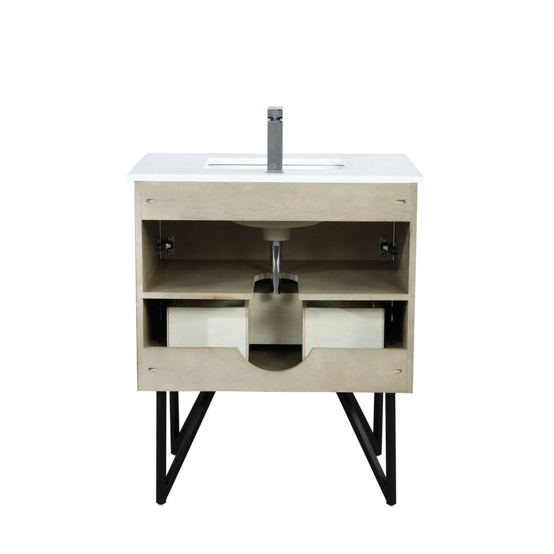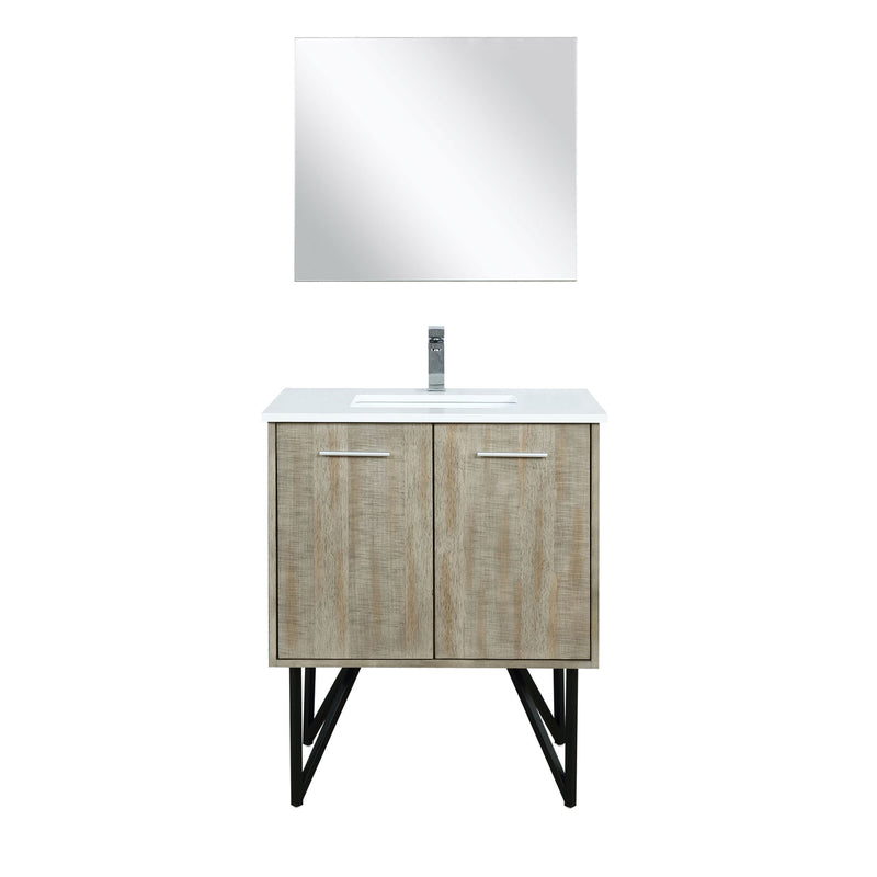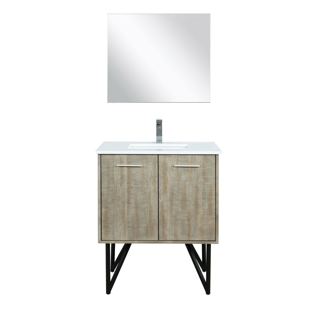 Lexora Lancy 30" Rustic Acacia Bathroom Vanity, White Quartz Top, White Square Sink, Labaro Brushed Nickel Faucet Set, and 28" Frameless Mirror LLC30SKSOSM28FBN
